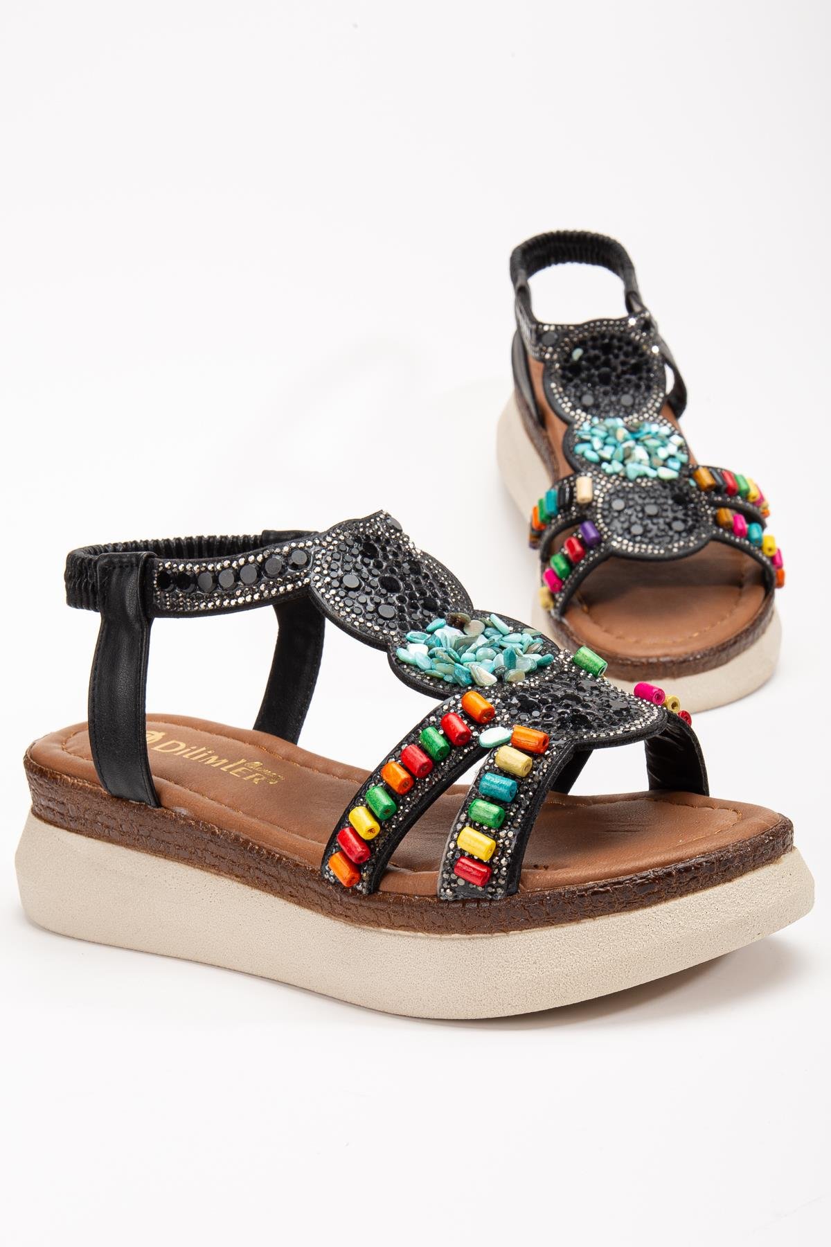 DOLGU TABAN BONCUKLU ÇİFT BANT KADIN SANDALETSİYAH